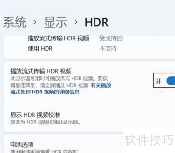 在Win11的显示设置中开启HDR,并将流媒体播放HDR视频的选项设为打开即可。