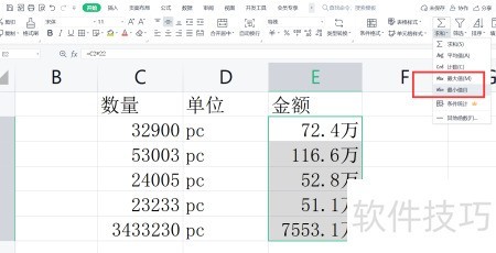 2、 点击求和,从下拉菜单中选择最小值。
