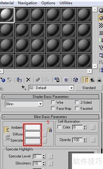 2、 此时材质类型已切换为(多维/子对象),默认包含10个子材质。点击按钮,在弹出的对话框中将数量设为2,确认后进入第一个子材质通道,点击按钮,进入标准材质参数界面。在该界面中,将漫反射颜色调整为白色,其他参数保持默认,完成基本材质设置。此操作为后续多材质分配奠定基础,适用于需要在同一模型上应用不同材质的场景。