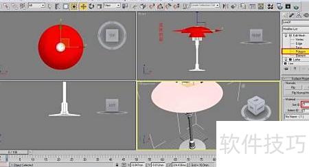 4、 为台灯添加编辑网格命令,开启多边形模式,在前视图中选中灯罩对应的面,接着在设置ID右侧的输入框内键入数字1,按回车确认,即可看到所示的效果。