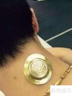 9、 撕去垫圈另一面胶纸,依次贴于大椎、风门、肺俞穴,图示以大椎穴为例。