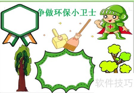 2、 在手抄报上方用立体字写上争做环保小卫士。