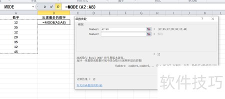 1、 统计A2至A8区域内出现最频繁的数字,并将结果展示在B2单元格中。