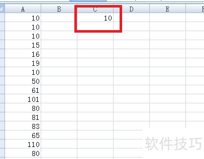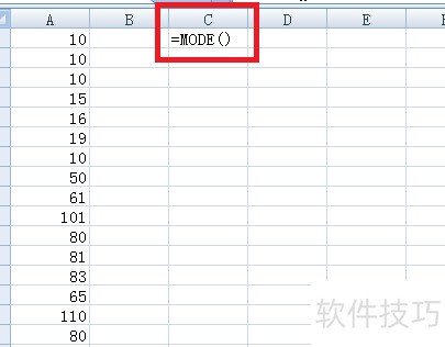 3、 在C1单元格输入=mode(,接着按Ctrl+A键...