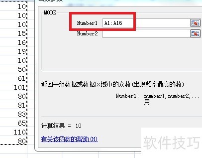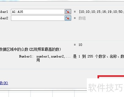 6、 利用mode函数分析A1:A16区域,发现出现次数最多的数值为10。