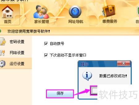 5、 点击后,提示框显示数据修改成功,确认后关闭界面。下次开机时,宽带拨号软件将不再弹出窗口,避免干扰使用。
