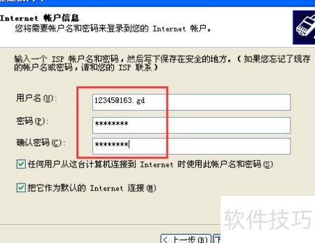 8、 输入宽带账号及密码,然后点击下一步完成操作。