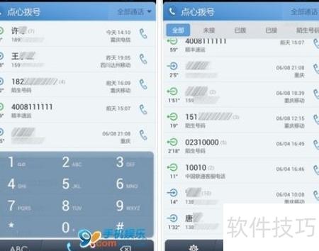 9、 触宝的默认拨号界面设计简洁宽敞,有效降低了误触概率。当同一号码多次出现在通话记录中时,系统仅保留最新的条目,避免重复显示。通话记录信息详尽清晰:对于已存联系人,直接展示对应姓名、号码及类型;未保存的号码则自动标注归属地,并能识别部分特殊服务号码,如顺丰快递、招商银行等,明确标注来源,方便用户快速辨识来电身份。