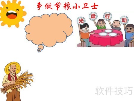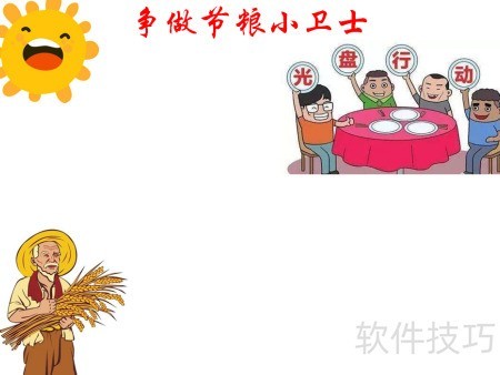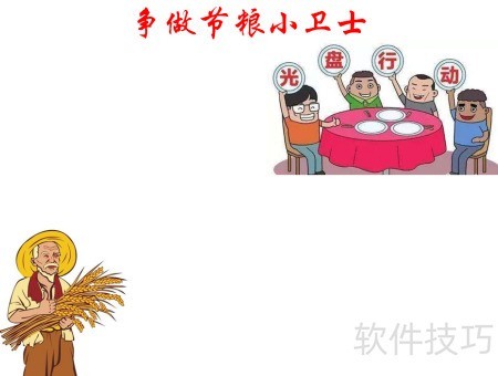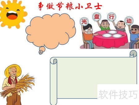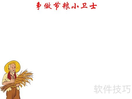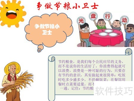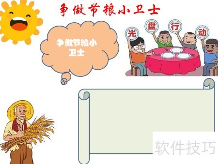 1、 在页面顶部书写争做节粮小卫士主题文字。