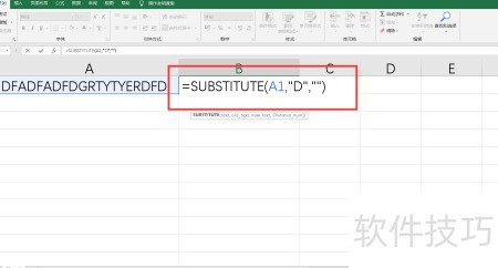 3、 在B1单元格输入公式=SUBSTITUTE(A1,D,),可将A1中字符D替换为空,实现字符串处理。