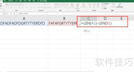 4、 在C1单元格输入公式=LEN(A1)-LEN(B1),通过原字符串与转换后字符串的长度差,计算字符D出现的总次数。