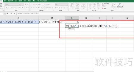 6、 可将两个函数合并为一个公式:=LEN(A1)-LEN(SUBSTITUTE(A1,D,)),用于统计A1中字符D的数量。