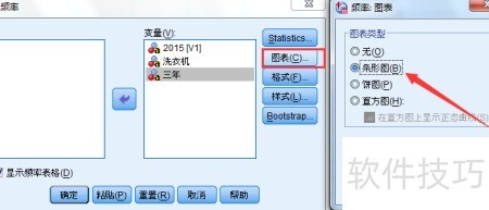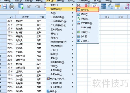 3、 进入顶部菜单,依次选择分析、描述、频率,操作见图三所示。