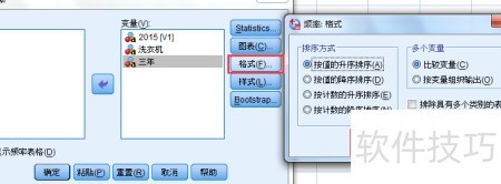 6、 在格式按钮中选择各字段生成频率的排序方式(例如升序),然后点击继续,六所示。