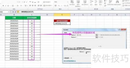 4、 在函数参数界面中,将光标置于number1后的输入框,然后在表格内选择需要统计的数据范围,确认后即可得出所选区域中出现次数最多的数值。