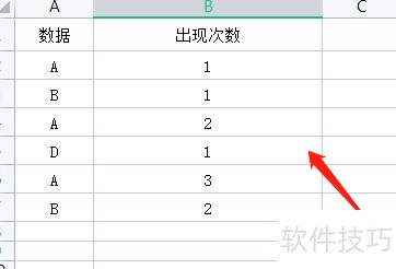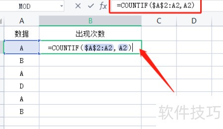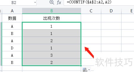 2、 在B2单元格中输入公式=COUNTIF(\$A\$2:A2,A2),然后按回车键确认。