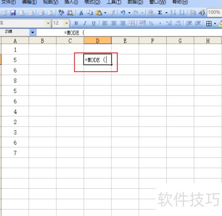 4、 在单元格中输入=MODE(,即可掌握其用法。