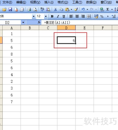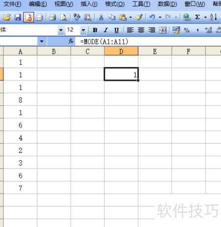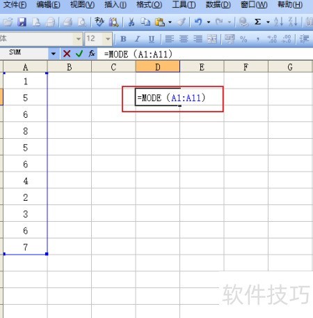 5、 使用公式=MODE(A1:A11),可找出A1至A11区域中出现次数最多的数字,即统计该范围内数据的众数。