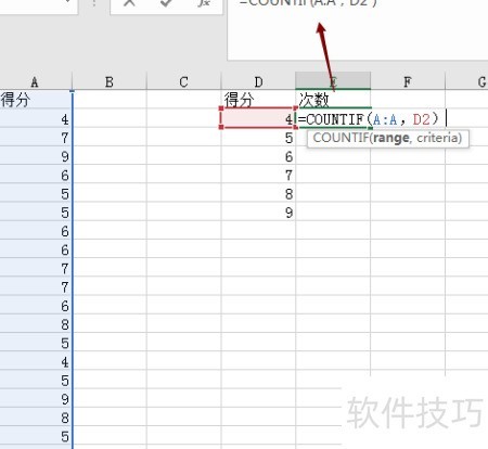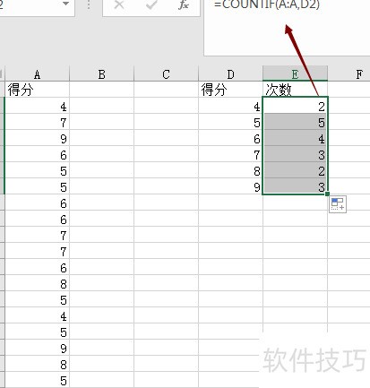 7、 利用COUNTIF函数统计:=COUNTIF(A:A,D2),实现数据频次计算。