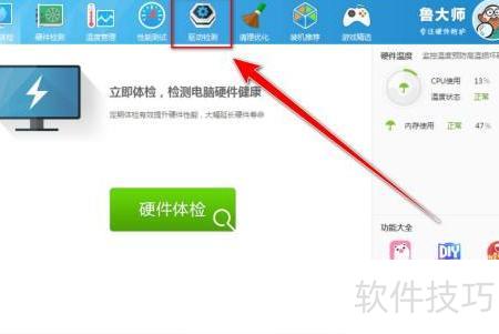 2、 打开鲁大师,点击顶部菜单中的驱动检测选项。