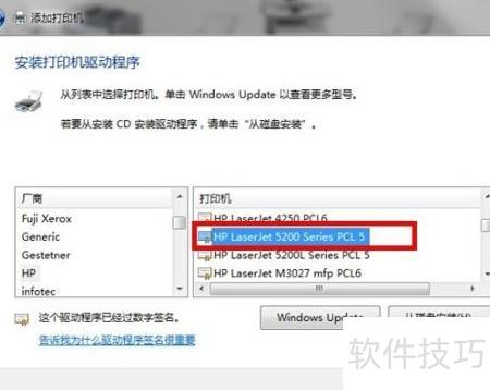 10、 选择左侧厂商为HP,右侧打印机型号为HP LaserJet 5200,然后点击下一步。图6