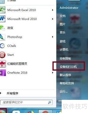 2、 进入开始菜单,选择设备和打印机