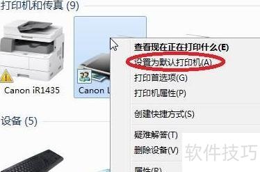 4、 右键单击所需打印机(如Canon LBP2900),在弹出菜单中选择设为默认打印机即可完成设置。