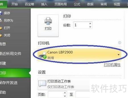 6、 重新打开一个可打印的表格,进入文件—打印选项,此时打印机已显示为Canon LBP2900,表明默认打印机设置成功。