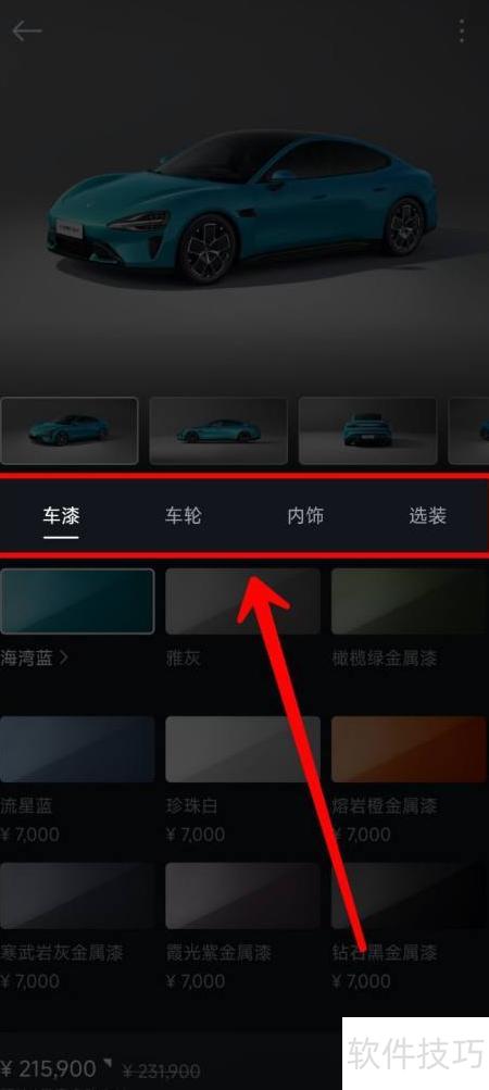 3、 依次选择车漆、轮毂、内饰及可选配置。