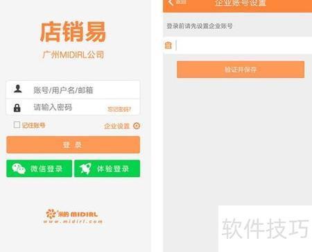 1、 在应用宝或AppStore中搜索并下载店销易APP,打开后进入企业设置,填写企业号并验证保存,最后输入账号密码完成登录。
