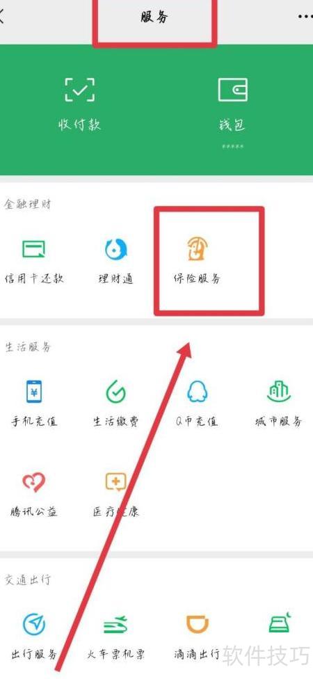 1、 打开手机微信,进入服务页,点击顶部保险服务选项。