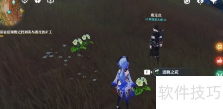 2、 可见NPC唐无仇,前方有三朵清心,最远处为远望之花,靠近按F采摘即可。