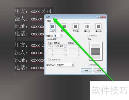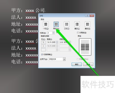 9、 在分栏设置中选择等宽双栏布局。