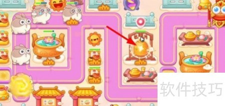 1、 左上角种满级太阳花,上方中间建一级导弹塔,优先攻击图示位置的蛋糕。