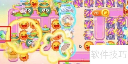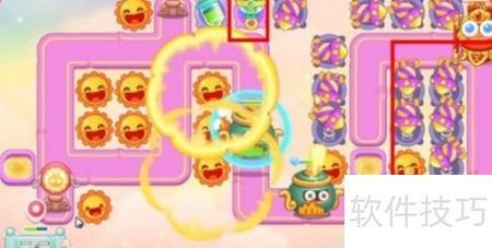 2、 击破蛋糕后建造太阳花,攻击附近时钟获取金币,用于升级太阳花。