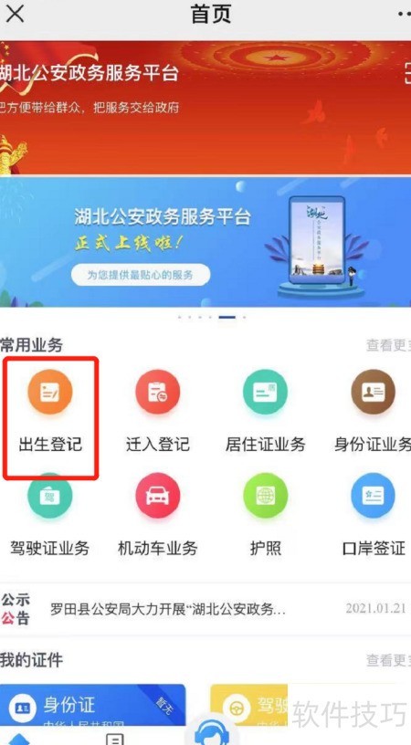 3、 在湖北公安政务服务平台页面下方选择出生登记并点击进入。
