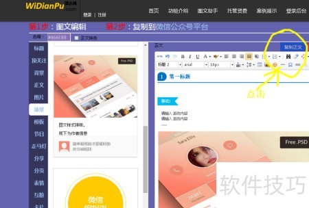 2、 访问 widianpu.com 在线图文编辑器,选择图文助手功能,左侧挑选分类并点击子项,右侧即显示预览效果,可直接编辑文字、图片或视频等内容。
