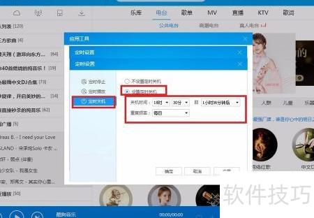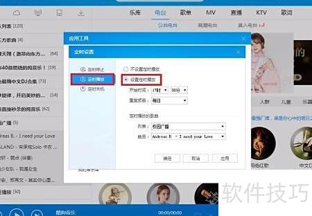 3、 点击右上角工具,选择应用工具中的定时设置,即可弹出歌曲定时播放的配置界面。