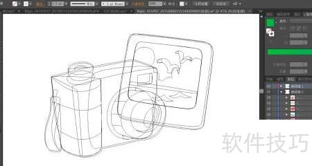 1、 用钢笔勾勒相机外形,细致描绘其旁照片的轮廓。着重刻画相机顶部按钮及前方镜头的精细结构与细节线条。