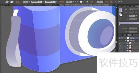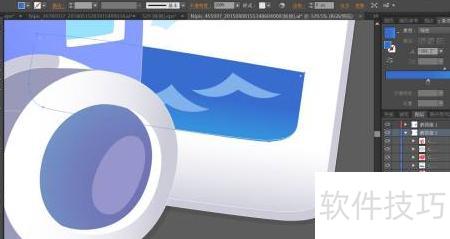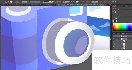 6、 将相机前端镜头与玻璃部分采用灰白至蓝色的渐变填充,高光区域以蓝白色描绘,镜头下方结构则用较亮的蓝灰色与灰白色组合呈现。