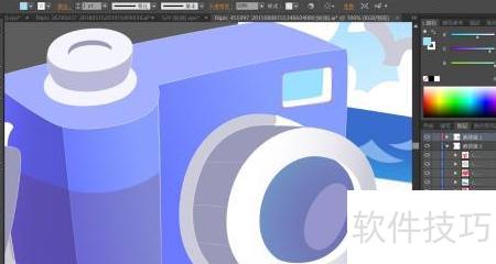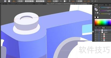 5、 以蓝紫色渐变填充相机正面,右上方灯光部件则用青色与白色进行填充。