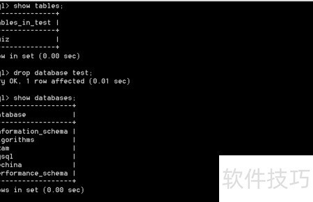 5、 第二种方法是执行 drop database test; 命令,即可彻底删除整个 test 数据库。为验证是否删除成功,可运行 show databases; 命令进行查看,若结果中不再包含 test 数据库,说明已成功移除。