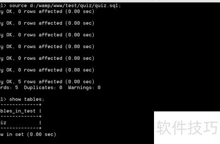 4、 第二种方法:在命令行输入 source 加上 quiz.sql 文件的完整路径,将数据表重新导入 test 数据库。随后执行 show tables;命令查看当前数据库中的所有表,即可看到 quiz 表已成功导入并显示在列表中。
