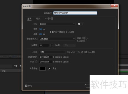 1、 启动AE,创建新合成,命名为劈柴文字效果,并设置相关参数。