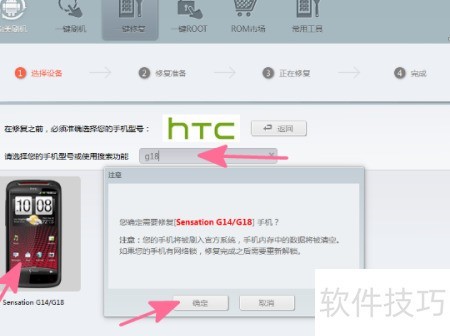 6、 根据提示选择对应机型,进入HTC选项后,在搜索栏输入手机型号,找到并点击Sensation G14/G18图标。选定设备后,页面将弹出确认窗口,询问是否执行HTC G18刷机操作,点击确定即可继续后续步骤。