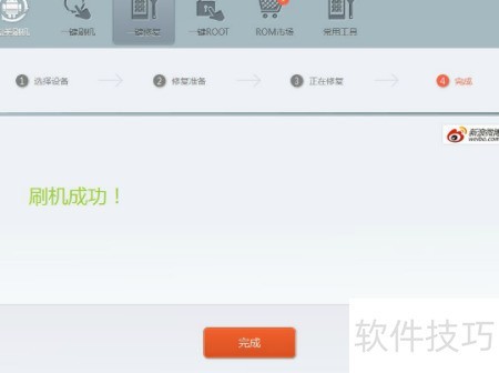 11、 时间悄然流逝,焦急等待后终于看到修复成功提示,这是HTC G18救砖的最后一步,立即点击完成,手机将自动重启,恢复正常运行。