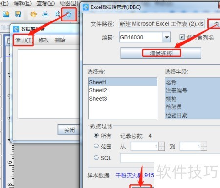 2、 利用条码标签打印软件的数据库导入功能,可将灭火器信息从多种格式如txt、Excel、Access及MySQL、SQL Server等数据库中导入并进行处理。