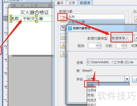 4、 在标签上添加一段普通文本,进入其图形属性中的数据源,将当前数据修改为名称:,操作方法与之前相同。随后点击左侧的+号新增数据项,选择从数据库导入灭火器合格证上的对应名称信息。