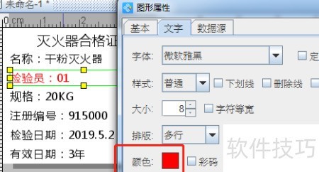 5、 其他如检验员、规格、注册编号、检验日期、有效日期等字段的导入方式与前一步相同,依次对应即可。可打开检验员文本属性,对字体颜色进行调整。