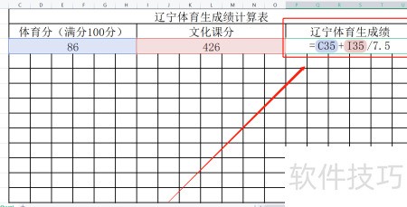 3、 在辽宁体育成绩的单元格内输入公式:C35加I35除以7.5。